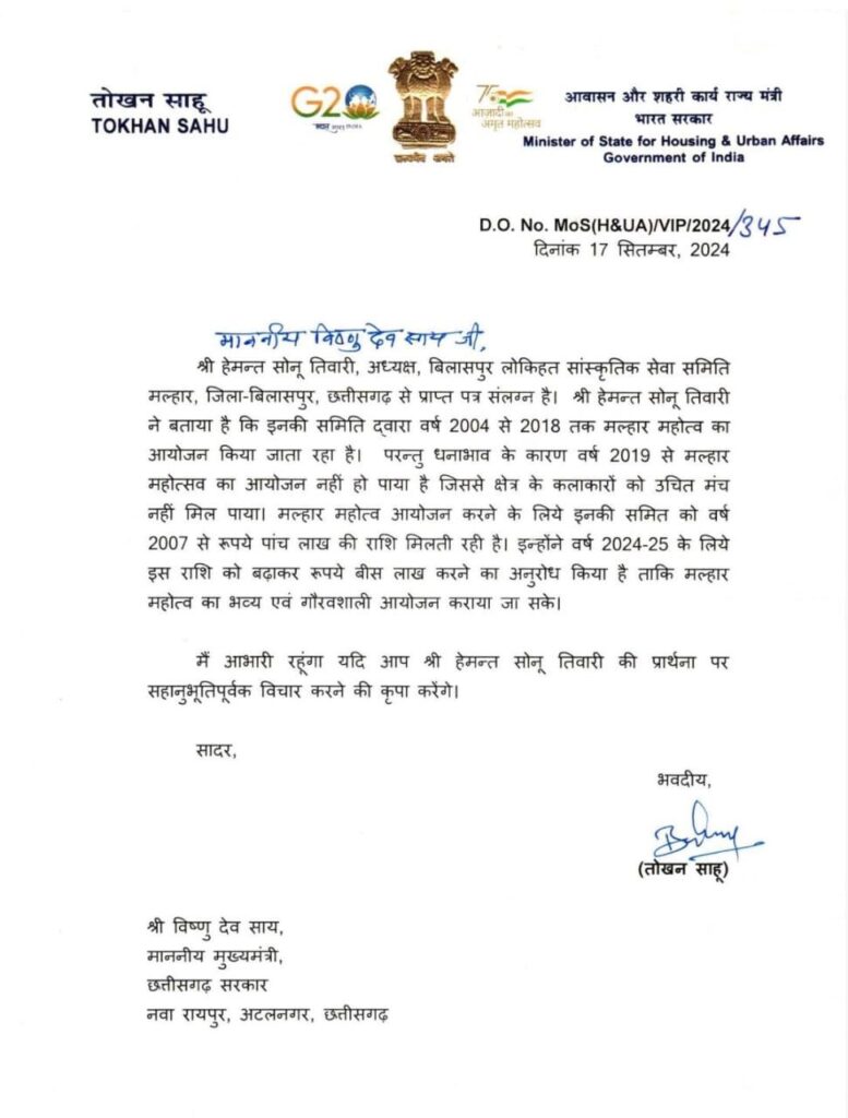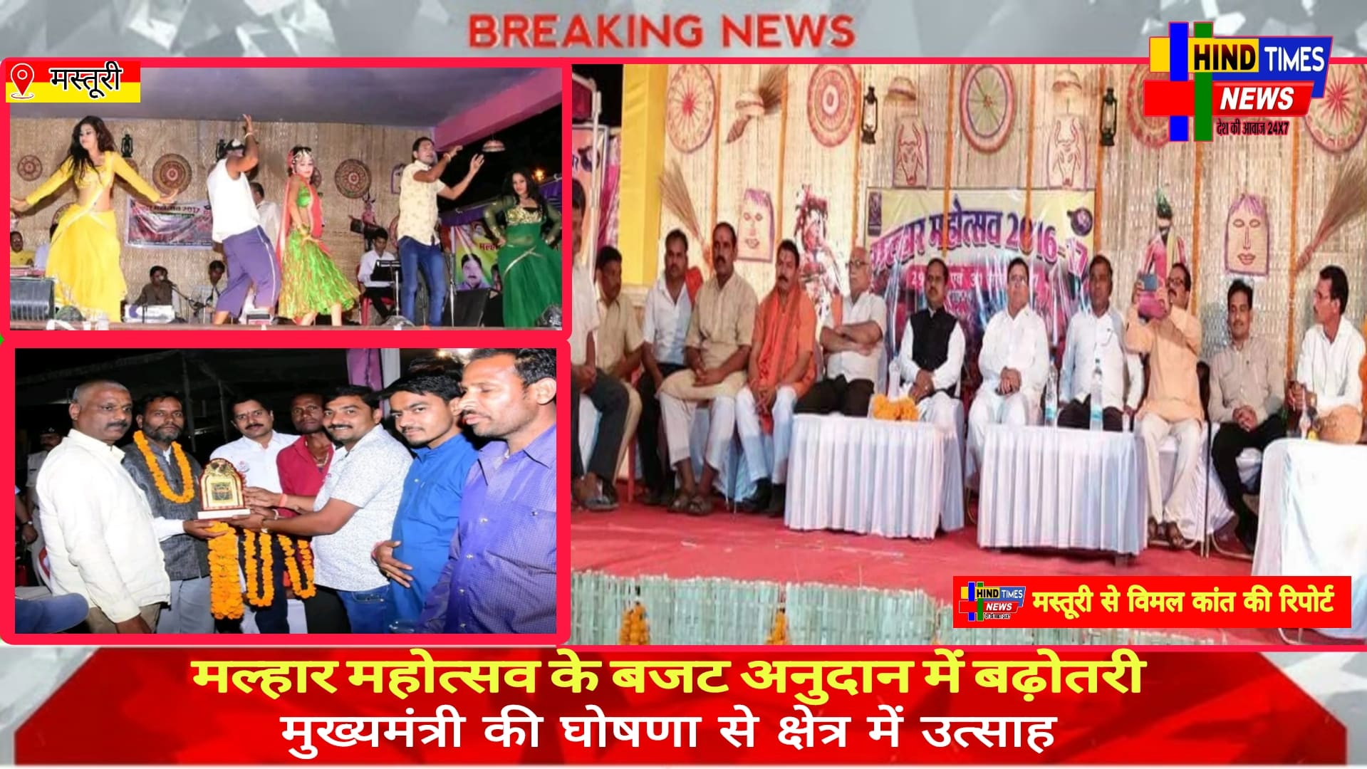 Hindtimes news मल्हार। माननीय मुख्यमंत्री द्वारा मल्हार महोत्सव के लिए बजट अनुदान को 5 लाख रुपये से बढ़ाकर 20 लाख रुपये किए जाने की घोषणा श्री तोखन साहू केंद्रीय मंत्री के अनुशंसा पर की गई है। यह घोषणा मल्हार महोत्सव समिति के अध्यक्ष हेमंत तिवारी के आग्रह पर की गई, जिसके बाद मल्हार और आसपास के क्षेत्र में खुशी की लहर दौड़ गई है।
