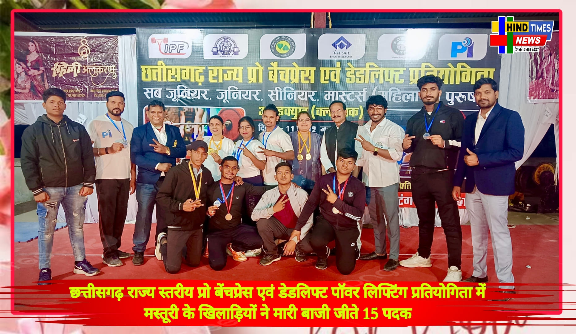 hindtimes news मस्तूरी – छत्तीसगढ़ राज्य स्तरीय प्रो बेंचप्रेस एवं डेडलिफ्ट पॉवर लिफ्टिंग प्रतियोगिता में मस्तूरी के खिलाड़ियों ने मारी बाजी जीते 15 पदक प्रतिवर्ष की भाँति छत्तीसगढ़ पॉवर लिफ्टिंग संघ के संयुक्त तत्वावधान में राज्य स्तरीय बेंचप्रेस एवं डेडलिफ्ट प्रतियोगिता 11-12 जनवरी2025 को दुर्ग भिलाई सेक्टर 6 में आयोजित की गई