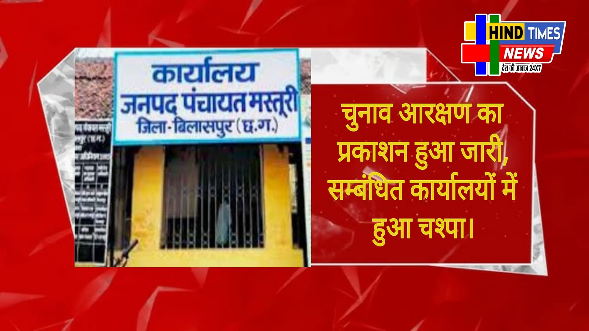Hindtimes news मस्तूरी। जिला पंचायत सदस्य, जनपद सदस्य, ग्राम पंचायत सरपंच एवं ग्राम पंचायत वार्ड पंच के आरक्षण का प्रकाशन सम्बन्धित कार्यालय के सुचना पटल में चस्पा कर प्रकाशन किया गया है। क्षेत्र के ग्रामीण व जनप्रतिनिधि संबंधित कार्यालय के सुचना पटल में आरक्षण संबंधित जानकारी देख सकते हैं या प्राप्त कर सकते हैं।