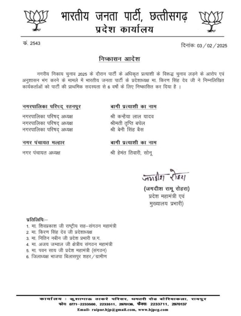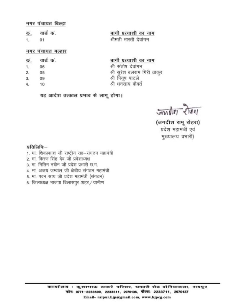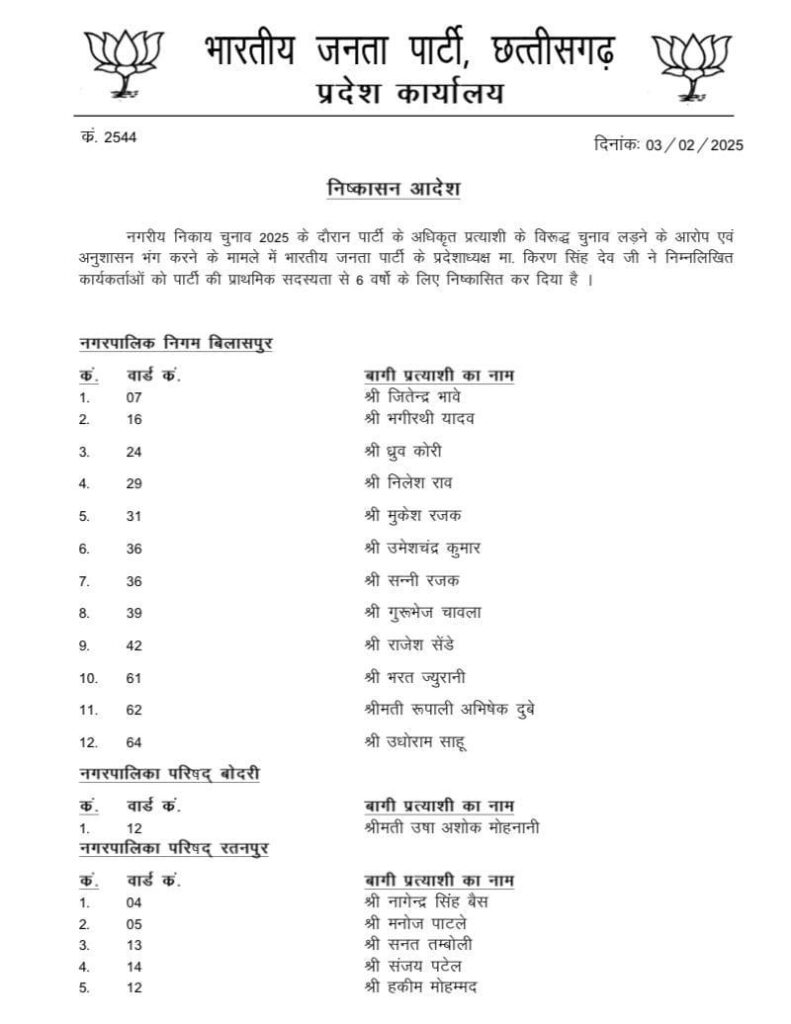 Hindtimes news 24×7 बिलासपुर । नगरीय निकाय चुनाव में पार्टी द्वारा प्रत्याशी नहीं बनाए जाने पर दावेदारों को निर्दलीय चुनाव लड़ना मंहगा पड़ गया है। भारतीय जनता पार्टी ने त्वरित कार्रवाई करते हुए अध्यक्ष पद के 4 प्रत्याशियों और पार्षद पद के लिए निर्दलीय चुनाव लड़ रहे 23 कार्यकर्ताओं को पार्टी से निष्कासित कर है। इसमें बिलासपुर नगर निगम में पार्षद चुनाव लड़ रहे 12 बागी कार्यकर्ता, बिल्हा का एक बोदरी का एक रतनपुर के 5 मल्हार के 4 कार्यकर्ता शामिल है। इसी तरह अध्यक्ष पद के लिए चुनाव लड़ रहे रतनपुर के 4 बागियों और मल्हार के एक बागी को भाजपा ने निष्कासित किया है। देखें जिन्हें निष्कासित किया गया है.