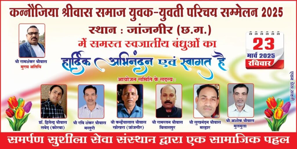 Hindtimes news समर्पण सुशीला सेवा संस्थान द्वारा एक सामाजिक पहल किया जा रहा है जिसमे विवाहयोग्य युवक – युवती समेत विधवा,विधुर व तलाकशुदा व्यक्तियों के लिए परिचय सम्मेलन का आयोजन शील साहित्य परिसर जांजगीर में 23 मार्च को संपन्न होने जा रहा है ।