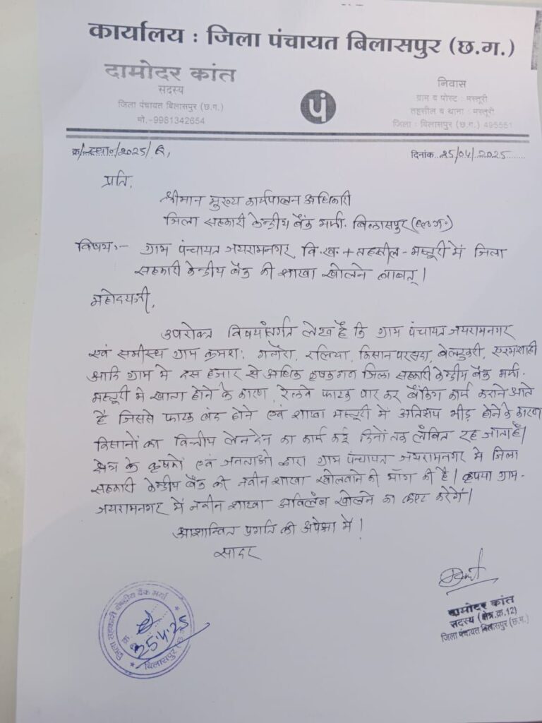 क्षेत्र के कृषकों एवं ग्रामीणों द्वारा ग्राम पंचायत जयरामनगर में जिला सहकारी केंद्रीय बैंक की नवीन शाखा खोलने की मांग लगातार क्षेत्रीय जनप्रतिनिधियों से भी किया जा रहा था, जिसको संज्ञान में लेते हुए मस्तूरी के जिला पंचायत सदस्य दामोदर कांत ने प्रमुखता से लेते हुए आज जिला सहकारी केंद्रीय बैंक के मुख्य कार्यपालन अधिकारी से सौजन्य मुलाकात कर किसानों की समस्याओं से अवगत कराते हुए उन्हें लिखित में ज्ञापन सौपा है, जिससे जयरामनगर परिक्षेत्र के हजारों किसानों को नए बैंक मिलने से लाभ मिल सके।