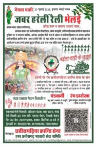 Hindtimes news छत्तीसगढ़ की लोकसंस्कृति की छटा बिखेरता एवं प्रकृति रक्षा का संदेश देता हुआ हरेली का त्योहार मनाने छत्तीसगढ़िया क्रान्ति सेना के तत्वावधान में प्रदेश भर से हजारों लोग रविवार को भिलाई में इकट्ठे होंगे । रैली के संबंध में प्रशासन अपनी चुस्त-दुरुस्त तैयारी कर चुका है । संगठन इसे बड़े पैमाने पर पिछले एक दशक से लगातार मनाते आ रहा है ।