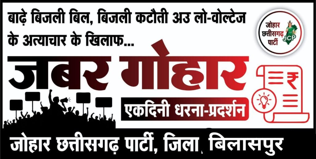 Hindtimes news बिलासपुर। शहर और ग्रामीण अंचल में बढ़ते बिजली बिल और लगातार बिजली कटौती की समस्या से त्रस्त जनता की आवाज अब सड़क पर गूंजने वाली है। जोहार छत्तीसगढ़ पार्टी ने इस मुद्दे को गंभीरता से उठाते हुए 23 सितम्बर 2025 को बिलासपुर के नेहरू चौक में एक दिवसीय धरना-प्रदर्शन करने की घोषणा की है। इस संबंध में पार्टी द्वारा जिला कलेक्टर को विधिवत सूचना दी गई है।