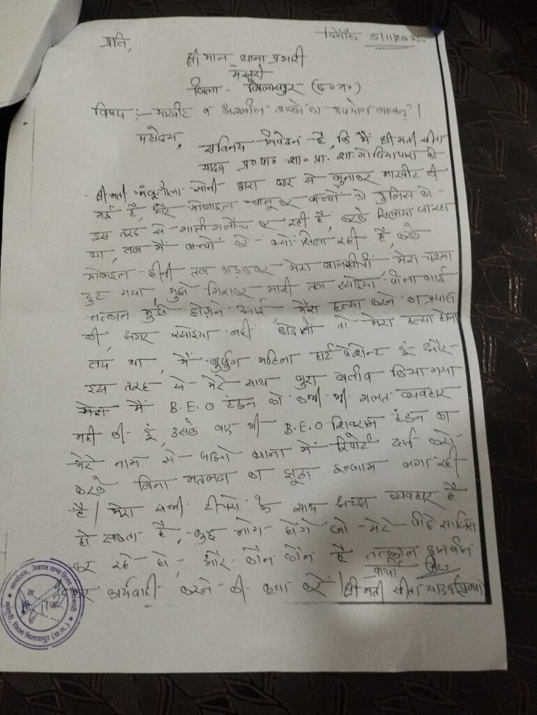 घटना के बाद प्रधानपाठीका शीला यादव ने मस्तूरी थाने पहुंचकर शिक्षिका मंजू सोनी के खिलाफ लिखित शिकायत दर्ज कराई। शिकायत में उन्होंने यह आरोप भी लगाया है कि घटना की जानकारी देने पर मस्तूरी विकासखंड शिक्षा अधिकारी ने मामले को गंभीरता से लेने के बजाय उल्टा उन पर ही दबाव बनाते हुए कहा – “जो करना है कर लो, थाने में शिकायत कर लो।” इससे प्रधानपाठीका मानसिक रूप से आहत हुईं।