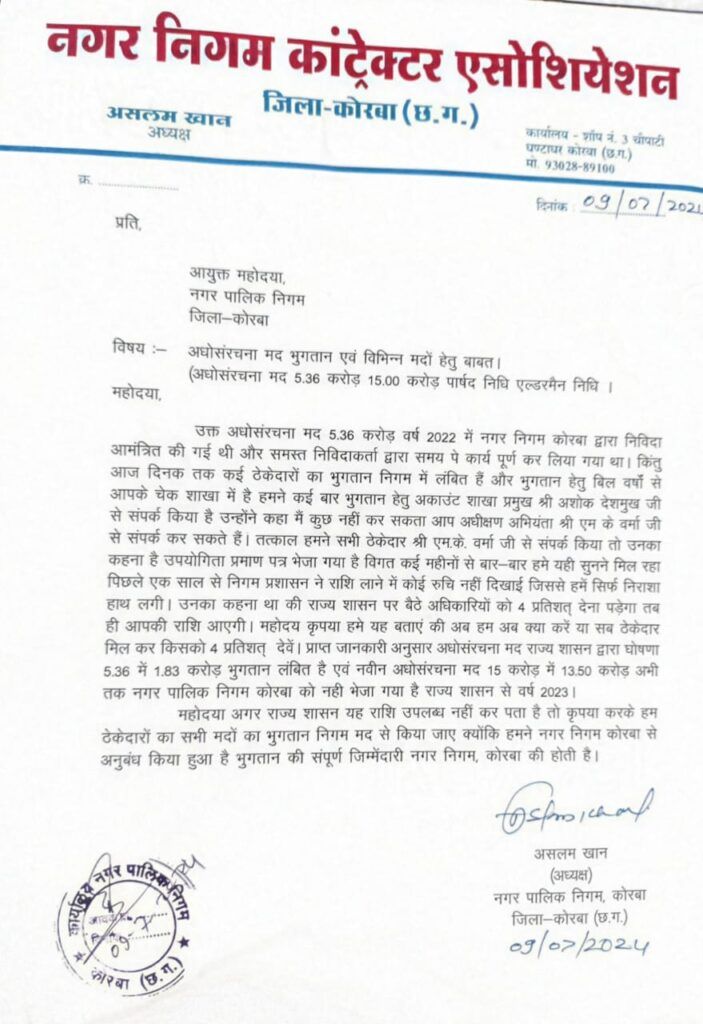 संघ ने अंत में लिखा है कि महोदया, अगर राज्य शासन यह राशि उपलब्ध नहीं कर पाता है तो कृपया करके हम ठेकेदारों का सभी मद का भुगतान निगम मद से किया जाए क्योंकि हमने नगर निगम कोरबा से एग्रीमेंट किया हुआ है, भुगतान की संपूर्ण जिम्मेदारी निगम की होगी ।