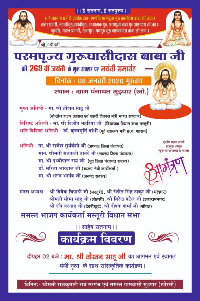 Hindtimes news सतनाम धर्म के प्रवर्तक, महान समाज सुधारक और आध्यात्मिक गुरु परम पूज्य गुरु घासीदास बाबा जी की 269वीं जयंती के पावन अवसर पर ग्राम पंचायत मुड़पार (खो.) में भव्य आयोजन किया जा रहा है। यह कार्यक्रम गुरुवार, 8 जनवरी 2026 को आयोजित होगा। जिसमें दोपहर 12बजे से लोक गायक गोरेलाल बर्मन का सांस्कृतिक कार्यक्रम भी प्रस्तुति आयोजित है।इस गरिमामय आयोजन में मुख्य अतिथि के रूप में माननीय श्री तोखन साहू जी, (केंद्रीय आवास एवं शहरी विकास राज्य मंत्री, भारत सरकार) उपस्थित रहेंगे।विशेष अतिथि के रूप में माननीय श्री दिलीप लहरिया, विधायक मस्तूरी विधानसभा तथा अति विशिष्ट अतिथि के रूप में डॉ. कृष्णमूर्ति बांधी, पूर्व स्वास्थ्य मंत्री, छत्तीसगढ़ शासन शामिल होंगे।कार्यक्रम में अन्य अतिथियों में माननीय श्री राजेश सूर्यवंशी (अध्यक्ष, जिला पंचायत), माननीय श्रीमती सतकली बावरे (सदस्य, जिला पंचायत), माननीय श्री पृथ्वीपाल राय (पूर्व जिला पंचायत सदस्य), डॉ. सरिता भारद्वाज (भाजपा नेत्री एवं समाजसेवी), माननीय श्री धरम भार्गव जी (जिला सदस्य) की उपस्थिति रहेगी।कार्यक्रम का शुभारंभ दोपहर 2 बजे मुख्य अतिथि के आगमन एवं स्वागत से होगा, जिसके पश्चात पंथी नृत्य सहित सांस्कृतिक कार्यक्रमों की प्रस्तुति दी जाएगी।इस अवसर पर परम पूज्य गुरु अमरदास बाबा, वीर, महान, राजगुरु गुरु बालकदास बाबा जी के योगदान को भी श्रद्धापूर्वक स्मरण किया जाएगा।आयोजन में मंडल अध्यक्ष श्री विवेक त्रिपाठी (मस्तूरी), श्री रंजीत सिंह ठाकुर (मल्हार), श्रीमती सीमा साहू (लोहर्सी), श्री वीरेंद्र पटेल (जयरामनगर), श्री रवि बरगाह (देवरीखुर्द), श्री दीपक शर्मा (सिपट) सहित मस्तूरी विधानसभा के समस्त भाजपा कार्यकर्ता शामिल होंगे।