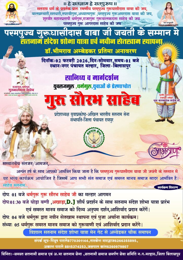 मस्तूरी/मल्हार।परम पूज्य बाबा गुरु घासीदास जी की जयंती के अवसर पर नगर पंचायत मल्हार में भव्य समारोह का आयोजन किया जा रहा है। कार्यक्रम के अंतर्गत नवीन जैतखाम की स्थापना, पाला चढ़ाने का कार्यक्रम एवं भारत रत्न डॉ. भीमराव अम्बेडकर जी की प्रतिमा का अनावरण किया जाएगा। यह आयोजन 02 फरवरी 2026, दिन सोमवार को नगर पंचायत मल्हार में संपन्न होगा।