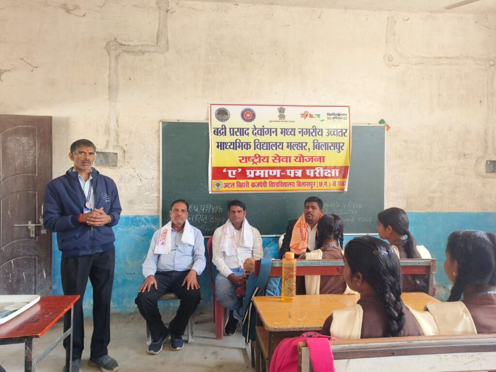 Hindtimes News नगर पंचायत मल्हार में स्थित मध्य नगरीय विद्यालय मल्हार में राष्ट्रीय सेवा योजना (एनएसएस) ‘A’ प्रमाण पत्र परीक्षा का सफल आयोजन किया गया। परीक्षा में एनएसएस स्वयंसेवकों ने उत्साह एवं अनुशासन के साथ भाग लिया।