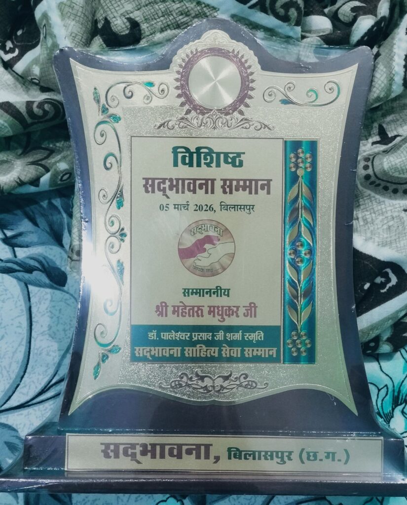 Hindtimes news24x7 पचपेड़ी। सद्भावना परिवार छत्तीसगढ़ के सौजन्य से 5 मार्च 2026 को आई. एम. ए. भवन सीएमडी चौक बिलासपुर में सद्भावना होली उत्सव का 17 वां वार्षिक आयोजन रखा गया जिसमें पचपेड़ी निवासी कवि एवं प्रधान पाठक महेतरु मधुकर जी को छत्तीसगढ़ी व हिन्दी साहित्य में योगदान के लिए डाॅ. पालेश्वर प्रसाद जी शर्मा स्मृति सद्भावना साहित्य सम्मान पालेश्वर प्रसाद शर्मा जी के सुपुत्र अभियंता राजीव नयन शर्मा जी के प्रेरणा से