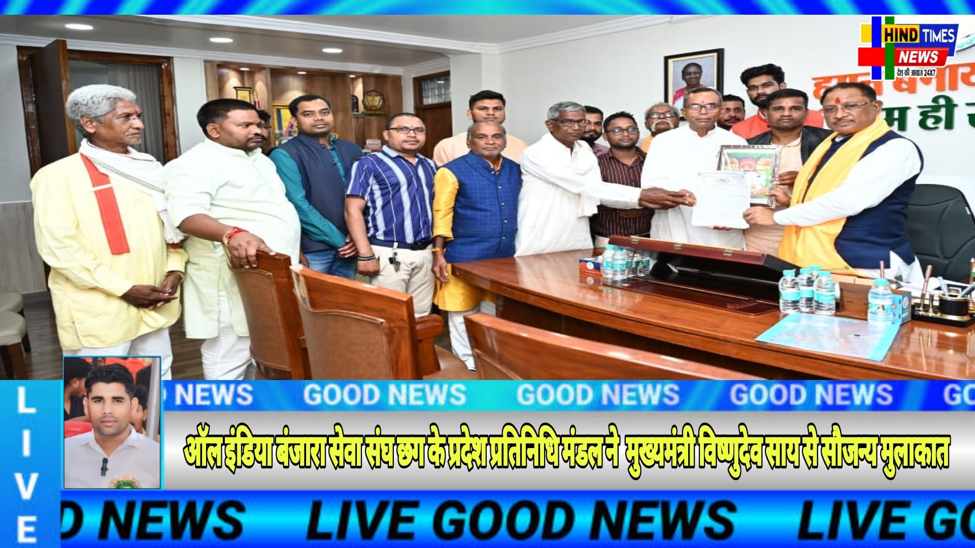 Hindtimes news 24X7ऑल इंडिया बंजारा सेवा संघ छग के प्रदेश प्रतिनिधि मंडल ने 27 अगस्त मंगलवार को मुख्यमंत्री विष्णुदेव साय से सौजन्य मुलाकात कर बंजारा समाज के आराध्य संत सेवालाल जी के छायाचित्र भेटकर एसटी प्रकरण, नया रायपुर मे छात्रावास, निगम मंडल आयोग मे प्रतिनिधित्व की मांग, सहित अन्य मुद्दों पर विस्तृत चर्चा किया गया तथा आगामी 15 सितंबर को रायपुर होने वाले राज्य स्तरीय बंजारा महासम्मेलन में मुख्यमंत्री विष्णुदेव साय जी ने आने की स्वीकृति प्रदान की है।