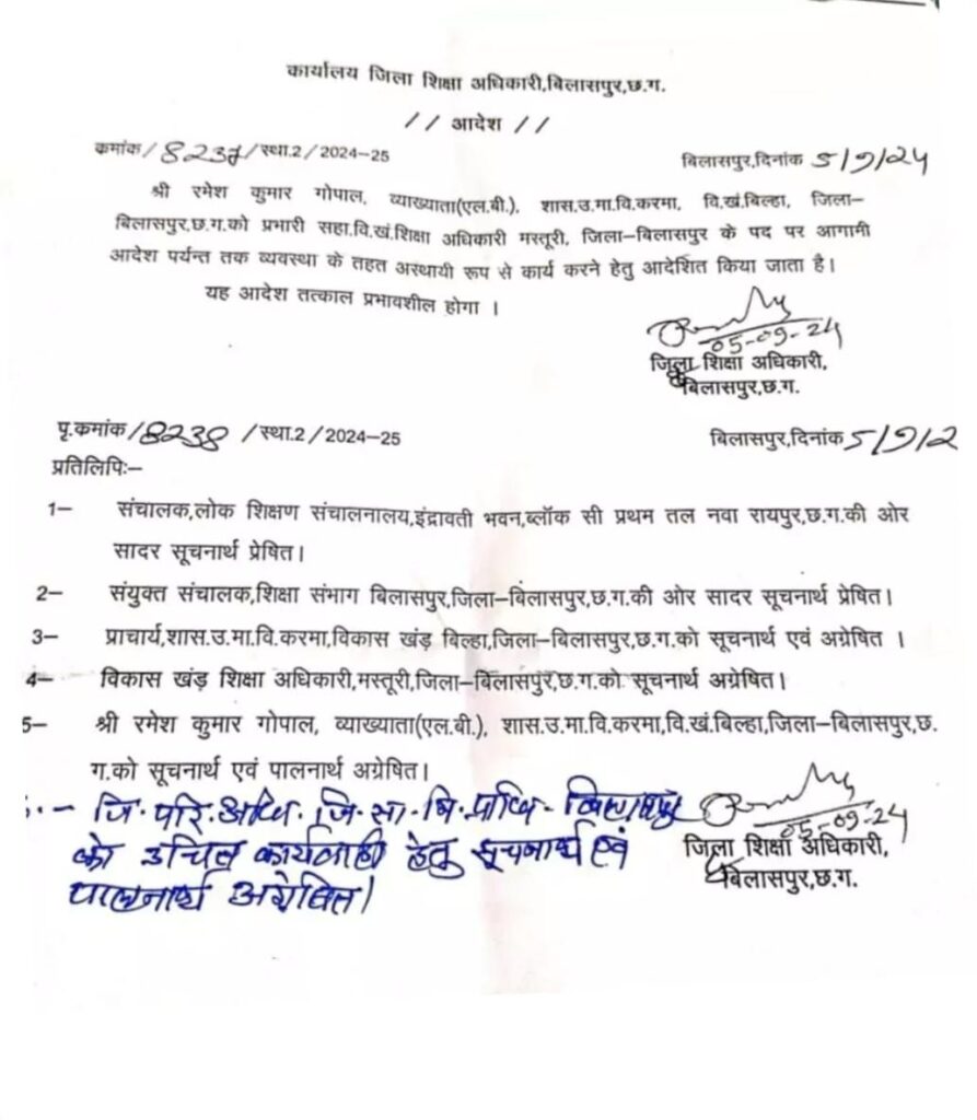 एडीबीईओ जबकि मस्तुरी शिक्षा विभाग में पहले से ही तीन एबीईओ मौजूद है लगता है साहब को इस त्योहार के पर्व में खूब ज्यादा मलाई मिला होगा तभी तो बिल्हा ब्लॉक के एक लेक्चरर को मस्तूरी ब्लॉक में पदस्थ करने का आदेश जारी कर दिया बता दे की इन दिनों कई स्कूलों में लेक्चरर की कमी तो कही एकल शिक्षक शिक्षिका है उस कमियों को दूर करने का समय नहीं है ध्यान न तो स्कूलों की पढ़ाई का स्तर सुधारने के बजाय देने के बजाय साहब तो खुद ही नियमो का धज्जियां उड़ा दी जबकि कलेक्टर से अनुमोदन कराना अनिवार्य होता है देखिए एडीबीईओ नियुक्ति का डीईओ का आदेश