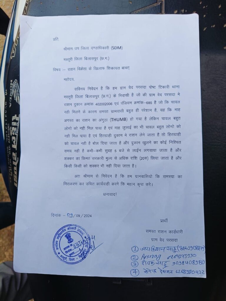 राशन दुकान संचालक की मनमानी से परेशान होकर ग्रामीणों ने इसकी शिकायत मस्तूरी एसडीएम से की है, जिसमें उन्होंने बताया कि दुकान संचालक के द्वारा हमेशा अपनी मनमानी की जा रही है अंगूठा लगवाकर बाद में राशन ले जाने की बात कही जाती है फिर राशन खत्म होने की जानकारी दी जाती है, सिर्फ आधे लोगो को राशन मिल पाता है, पिछले 2 महीनों से राशन का चावल पूरे लोगों को नही मिल पाया है, कुछ लोगों को वितरण कर स्टॉक नही आया है बोला जा रहा है। दुकान संचालक की मनमानी से सभी त्रस्त है, लिहाज़ा सभी ने इस समस्या का निराकरण कर उचित कार्रवाई करने की मांग की है।