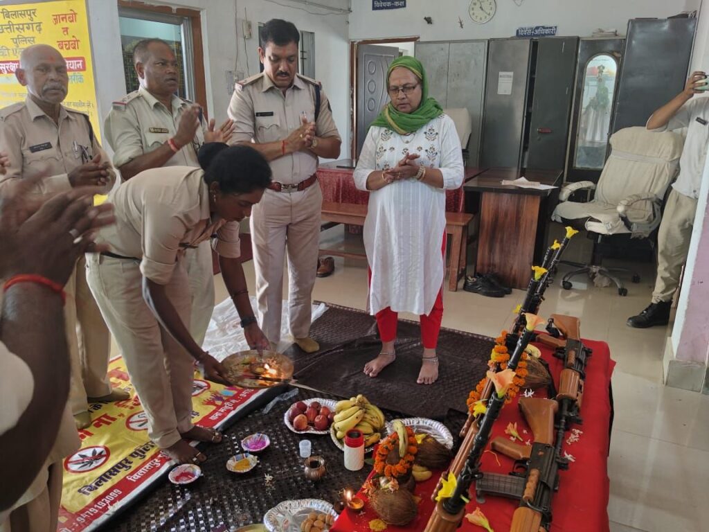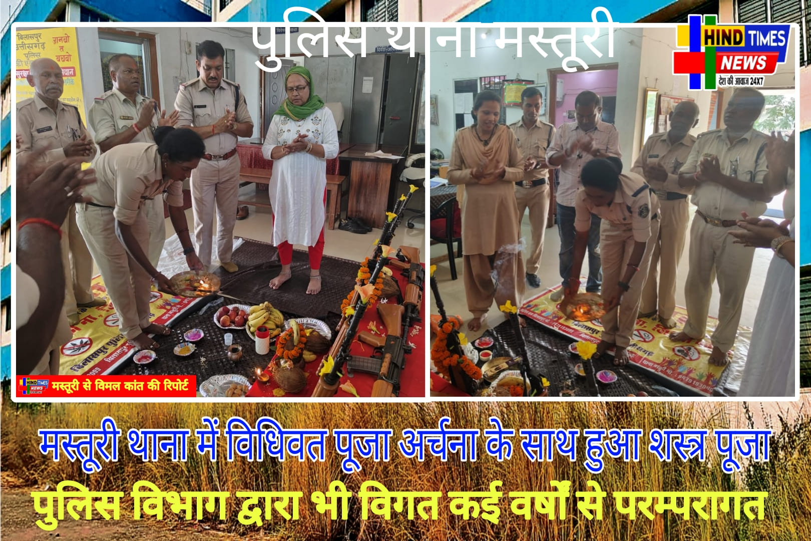 Hindtimes news मस्तूरी।विजय दशमी यानी दशहरे के दिन को बुराई पर अच्छाई की जीत के रूप में मनाया जाता है. इस दिन भगवान राम ने रावण का वध किया था इसलिए हर साल विजय दशमी के दिन रावण का पुतला जलाया जाता है. इस दिन शस्त्रों की भी पूजा की जाती है. यानी इस दिन बंदूक से लेकर तलवार, कटार, लाठी आदि शस्त्रों की पूजा की जाती है.इसी तारतम्य में आज मस्तूरी थाना में भी स्टाप के पुलिसकर्मियों ने विधिवत पूजा अर्चना कर थाना क्षेत्र में सुख शांति का कामना किया गया।