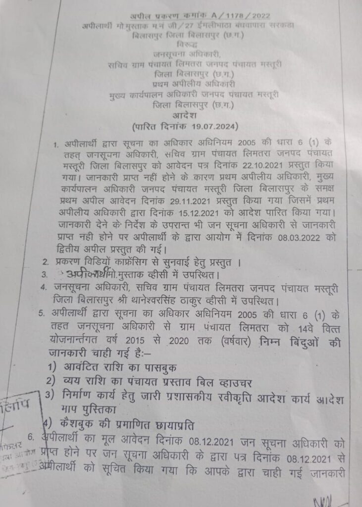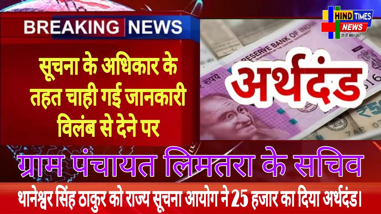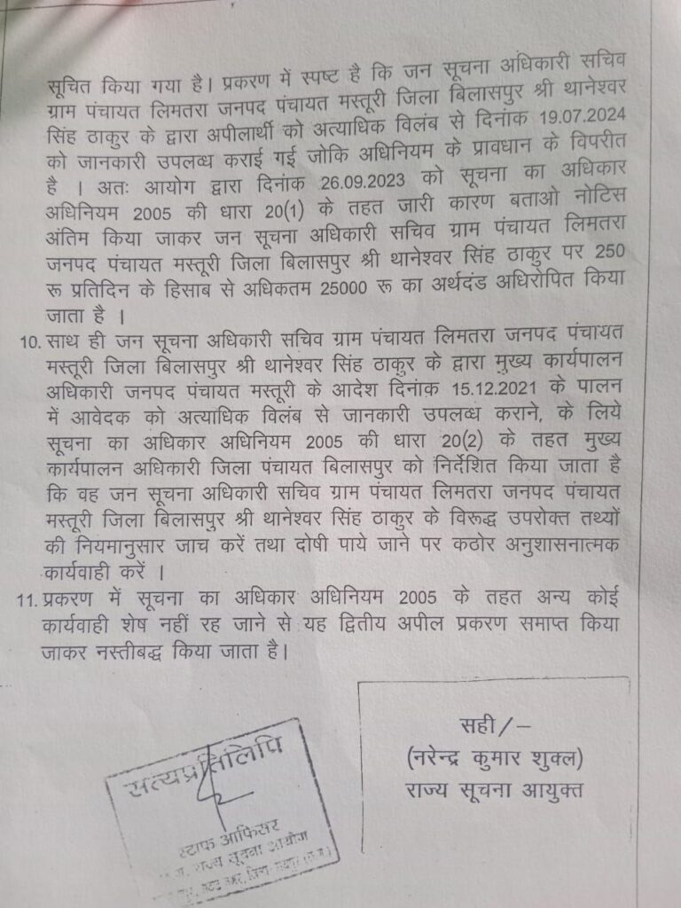Hindtimes news मस्तूरी।बिलासपुर सरकंडा निवासी एक आवेदक ने सुचना के अधिकार अधिनियम 2005की धारा 6 (1) के तहत जनसूचना अधिकारी ग्राम पंचायत लिमतरा को 14वे वित्त योजनान्तर्गत वर्ष 2015 से 2020 तक (वर्षवार) व्यय राशि का पंचायत प्रस्ताव बिल व्हाउचर,निर्माण कार्य हेतु जारी प्रशासकीय रवीकृति आदेश कार्य आदेश,माप पुस्तिका ,कैशबुक की प्रमाणित छायाप्रति, की जानकारी मांगी थी,जिसे जन सूचना अधिकारी सचिव ग्राम पंचायत लिमतरा जनपद पंचायत मस्तूरी के थानेश्वर सिंह ठाकुर के द्वारा अपीलार्थी को अत्याधिक विलंब से जानकारी उपलब्ध कराई गई जोकि अधिनियम के प्रावधान के विपरीत है,जिस कारण राज्य सूचना आयोग द्वारा सूचना का अधिकार अधिनियम 2005 की धारा 20 (1) के तहत जारी कारण बताओ नोटिस जारी करते हुए सूचना अधिकारी सचिव ग्राम पंचायत लिमतरा जनपद पंचायत मस्तूरी जिला बिलासपुर के थानेश्वर सिंह ठाकुर पर 250 रू प्रतिदिन के हिसाब से अधिकतम 25000 रु का अर्थदंड अधिरोपित किया है।साथ ही जन सूचना अधिकारी सचिव ग्राम पंचायत लिमतरा थानेश्वर सिंह ठाकुर के द्वारा मुख्य कार्यपालन अधिकारी जनपद पंचायत मस्तूरी के आदेश के पालन में आवेदक को अत्याधिक विलंब से जानकारी उपलब्ध कराने, के लिये सूचना का अधिकार अधिनियम 2005 की धारा 20 (2) के तहत मुख्य कार्यपालन अधिकारी जिला पंचायत बिलासपुर को निर्देशित किया है कि वह जन सूचना अधिकारी सचिव ग्राम पंचायत लिमतरा थानेश्वर सिंह ठाकुर के विरूद्ध उपरोक्त तथ्यों की नियमानुसार जाच करें तथा दोषी पाये जाने पर कठोर अनुशासनात्मक कार्यवाही करने को निर्देश दिए हैं।